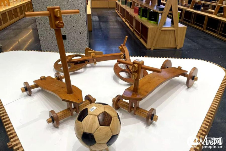 以竹子制成的儿童玩具、足球。人民网记者 林盈摄